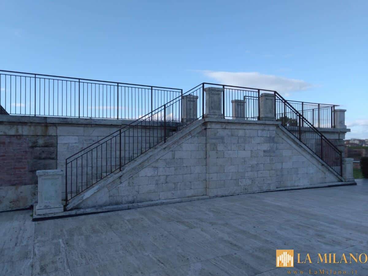 Sono stati inoltre sostituiti i parapetti in vetro: nel corso del tempo i parapetti hanno ripetutamente subito rotture e manomissioni, in particolar modo nella parte vetrata a riempimento del parapetto metallico, determinando così un forte rischio per l’incolumità pubblica. Per questo motivo si è ritenuto opportuno mettere al loro posto dei parapetti in acciaio corten. L’intervento si completa con la riqualificazione della zona verde nella parte retrostante l’antico deposito.