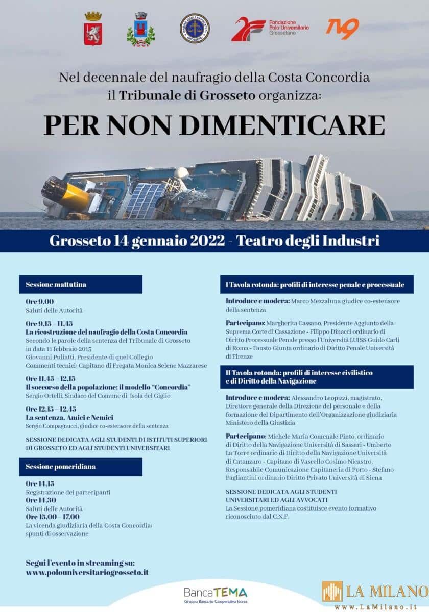 Grosseto, nel decennale del naufragio della Costa Concordia il Tribunale organizza venerdì 14 gennaio il convegno dal titolo “Per non dimenticare”, in collaborazione con il Comune di Grosseto, la Fondazione Polo Universitario Grossetano, il Comune di Isola del Giglio, l’Ordine degli Avvocati di Grosseto, TV9 e Banca Tema.