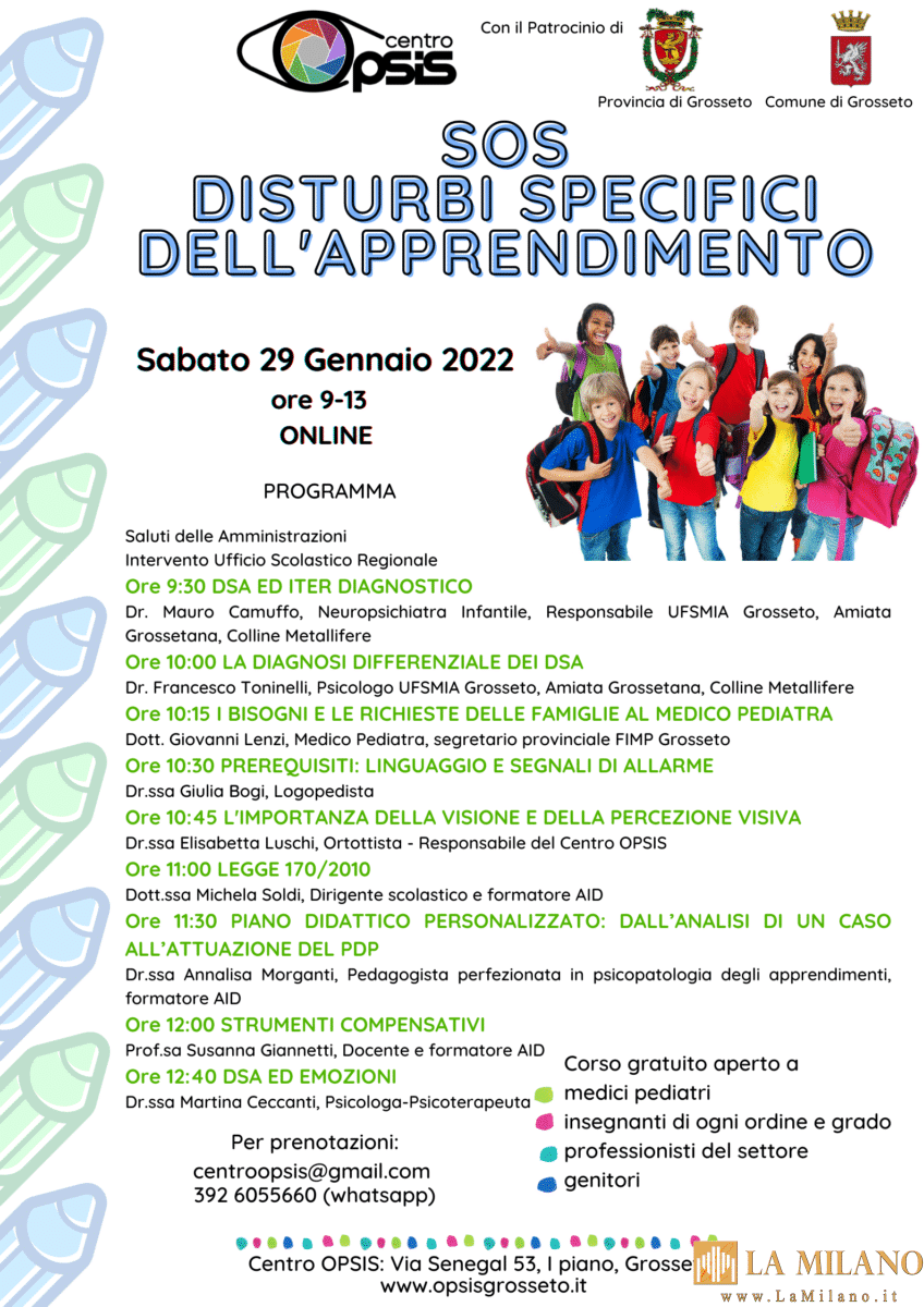 Grosseto, sabato 29 gennaio alle 9, in modalità online, si terrà il seminario organizzato dal Centro OPSIS dal titolo “SOS Disturbi Specifici dell’Apprendimento”. L’iniziativa, patrocinata dal Comune di Grosseto e dalla Provincia, è nata con l’obiettivo di sensibilizzare la popolazione sull’argomento dei DSA. L’evento è gratuito e rivolto a genitori, insegnanti di ogni ordine e grado, medici pediatri e professionisti del settore. Per informazioni e iscrizioni è possibile contattare la mail centroopsis@gmail.com.